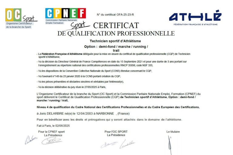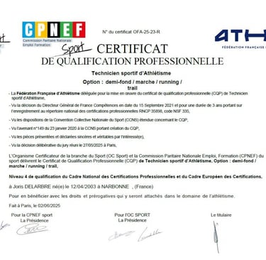 Étant certain que le monde de l'entraînement sportif est ce qui me plaît, je me lance dans un Certificat de Qualification Professionnelle de Technicien Sportif de l'Athlétisme. J'obtiens mon diplôme en mai 2025.